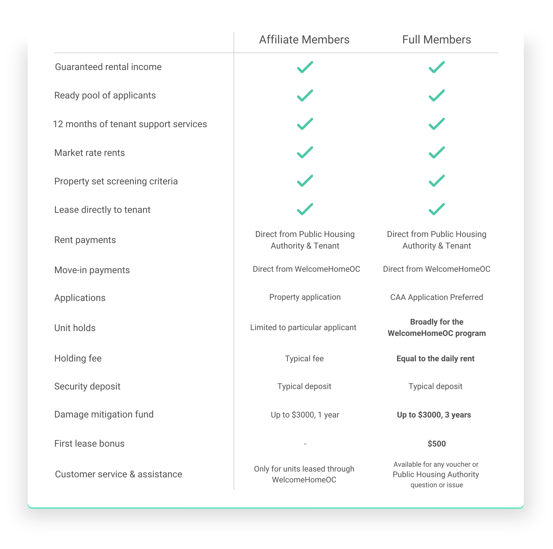 Rental partners who opt for a Full Membership in the Property Provider Network receive the maximum benefits available from WelcomeHomeOC while also benefiting from the peace of mind of knowing where their next tenant will come from and that WelcomeHomeOC will be there to support them through every step.