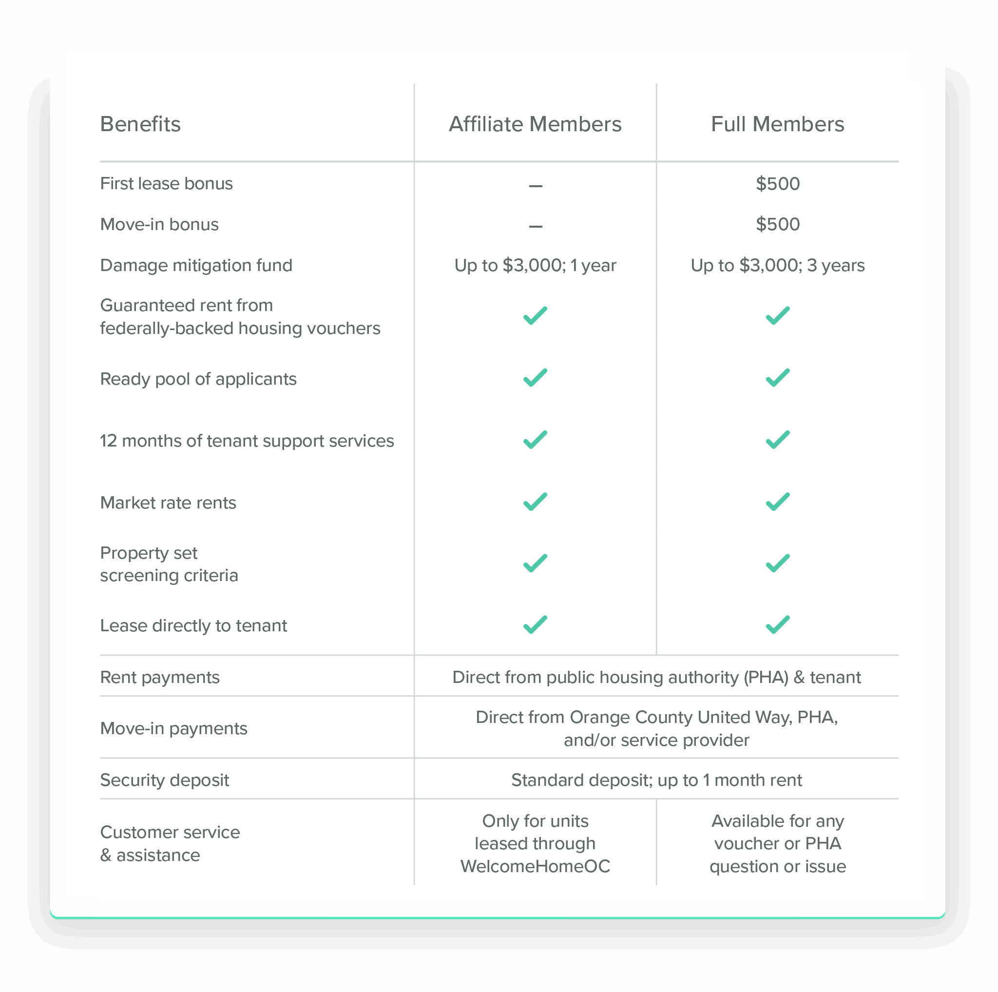 Rental partners who opt for a Full Membership in the Property Provider Network receive the maximum benefits available from WelcomeHomeOC while also benefiting from the peace of mind of knowing where their next tenant will come from and that WelcomeHomeOC will be there to support them through every step.